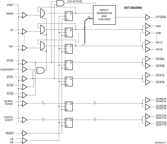 The SSTUB32865 also integrates a parity function, which accepts a parity bit from the memory controller, compares it with the data received on the D-inputs and indicates whether a parity error has occurred on its open-drain PTYERR pin (active LOW).