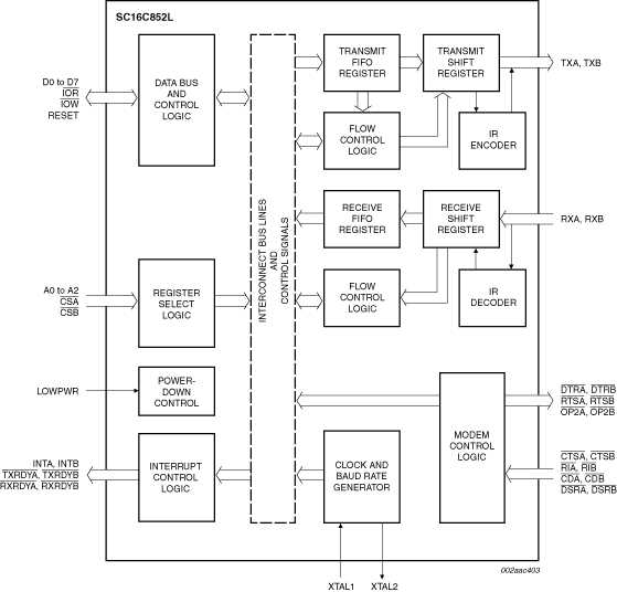 The SC16C852L is a 1.8 V, low power, dual channel Universal Asynchronous Receiver and Transmitter (UART) used for serial data communications. Its principal function is to convert parallel data into serial data and vice versa. The UART can handle serial data rates up to 5 Mbit/s. The SC16C852L is pin compatible with the SC16C652B. SC16C852L can be programmed to operate in extended mode (see Section 6.2) where additional advanced UART features are available. The SC16C852L UART provides enhanced UART functions with 128-byte FIFOs, modem control interface, DMA mode data transfer, and IrDA encoder/decoder. The DMA mode data transfer is controlled by the FIFO trigger levels and the TXRDYx and RXRDYx signals. On-board status registers provide the user with error indications and operational status. System interrupts and modem control features may be tailored by software to meet specific user requirements. An internal loopback capability allows on-board diagnostics. Independent programmable baud rate generators are provided to select transmit and receive baud rates.