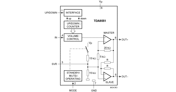 The TDA8551T is a one channel 1 W Bridge-Tied Load (BTL) audio power amplifier capable of delivering 1 W output power to an 8 Ω load at THD = 10% using a 5 V power supply. The circuit contains a BTL power amplifier, a digital volume control, and standby/mute logic. The TDA8551T comes in an 8-pin SO package and the TDA8551 in an 8-pin DIP package.