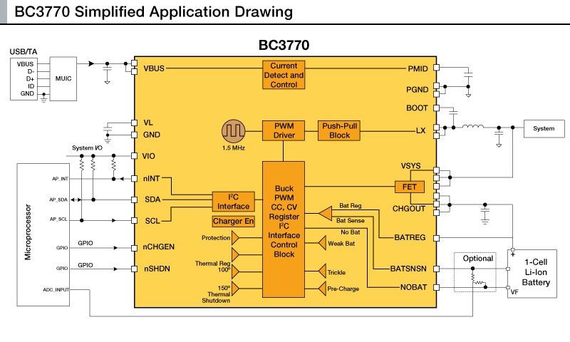 The NXP® BC3770 is a fully programmable switching charger with dual-path output for single-cell Li-Ion and Li-Polymer battery. The dual-path output allows mobile applications with a fully discharged battery to boot up the system.