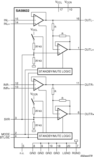 The SA58632 is a two-channel audio amplifier in an HVQFN20 package. It provides power output of 2.2 W per channel with an 8 Ω load at 9 V supply. The internal circuit is comprised of two BTL (Bridge-Tied Load) amplifiers with a complementary PNP-NPN output stage and standby/mute logic. The SA58632 is housed in a 20-pin HVQFN package, which has an exposed die attach paddle enabling reduced thermal resistance and increased power dissipation.