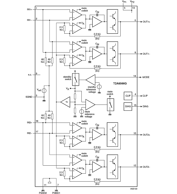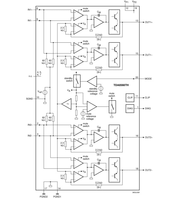 The device contains 2 amplifiers in a Bridge-Tied Load (BTL) configuration. The output power is 2 x 25 W in a 4 Ω load or 2 x 40 W in a 2 Ω load. It has a differential input stage and 2 diagnostic outputs. The device is primarily developed for car radio applications.