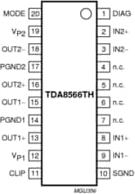 The TDA8566 is an integrated class-B output amplifier which is available in several packages. TDA8566TH is contained in a 20-lead small outline plastic package. The TDA8566TH1 is a 24-lead small outline plastic package which is pin compatible with the I²C-bus controlled amplifier TDA1566TH for one board layout. TDA8566Q is a 17-pin DIL-bent-SIL package.
