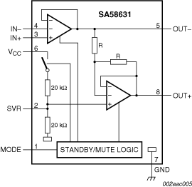 The SA58631 is a one channel audio amplifier in an HVSON8 package. It provides power output of 3 W with an 8 Ω load at 9 V supply. The internal circuit is comprised of a BTL (Bridge Tied Load) amplifier with a complementary PNP-NPN output stage and standby/mute logic. The SA58631 is housed in an 8-pin HVSON package which has an exposed die attach paddle enabling reduced thermal resistance and increased power dissipation.
