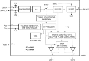 32 kHz watch circuit with programmable adaptive motor pulse