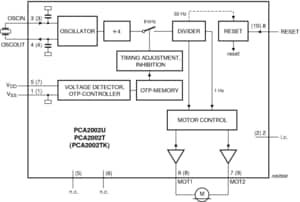 The PCA2002 is a CMOS integrated circuit for battery operated wrist watches with a 32 kHz quartz crystal as the timing element and a bipolar stepping motor. The quartz crystal oscillator and the frequency divider are optimized for minimum current consumption. A timing accuracy of 1 ppm is achieved with a programmable, digital frequency adjustment.