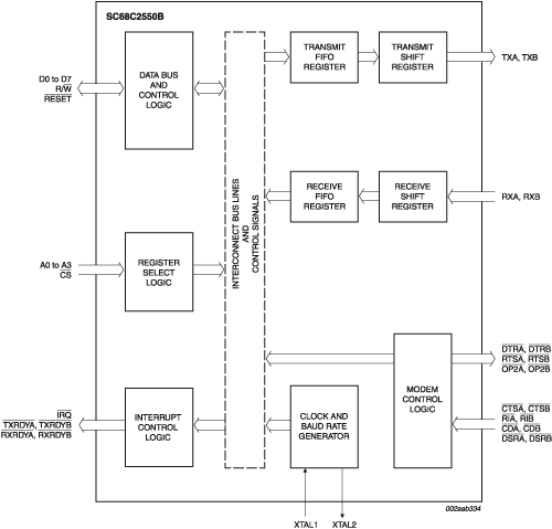 The SC68C2550B is a two channel Universal Asynchronous Receiver and Transmitter (UART) used for serial data communications. Its principal function is to convert parallel data into serial data and vice versa. The UART can handle serial data rates up to 5 Mbit/s.