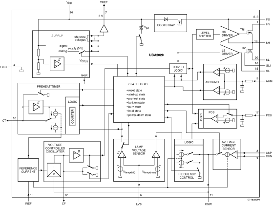 The UBA2028 is a high voltage power IC that drives and controls electronically ballasted Compact Fluorescent Lamps (CFLs). The IC includes a Metal-Oxide-Semiconductor Transistor (MOST) half-bridge power circuit, a dimming function, a high voltage level shift circuit, an oscillator function, a lamp voltage monitor, a current control function, a timer function and various protections.