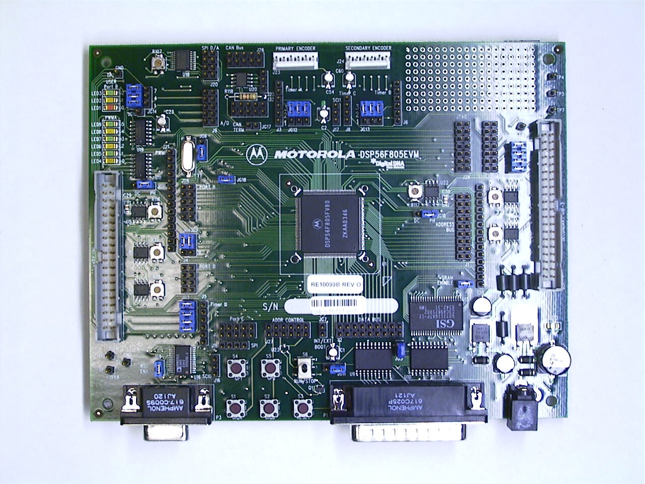 The 56F805EVM kit is a low-cost kit that contains everything you need to quickly evaluate the features and capabilities of the 56F805 digital signal controller and tools. It also provides an efficient, cost-effective vehicle for hardware and software development. It can be used alone or in conjunction with Our broad range of modular motion control development hardware. The DSP56F805EVM Kit is targeted for use on PC-compatible systems running Windows 95, Windows 98, Windows 2000, Windows ME and Windows NT 4.0.