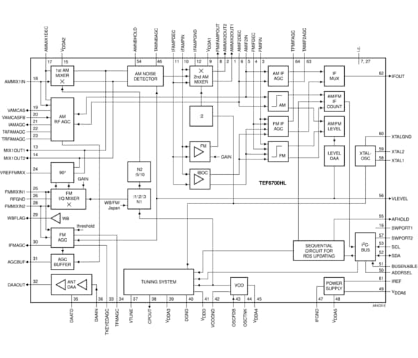 The TEF6700HL is a single chip car radio tuner for AM, FM standard, FM IBOC DAB and weather band providing gain controlled output of FM IF and AM IF2 for a car IF DSP IC (e.g. SAA7724H) including the following functions:
