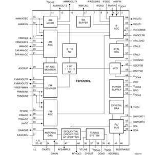 The TEF6721HL is a single chip car radio tuner for AM, FM standard, FM In-Band On-Channel Digital Audio Broadcast (IBOC DAB) and weather band providing combined AM and FM gain controlled differential Intermediate Frequency (IF) output for the SAF7730H including the following functions: