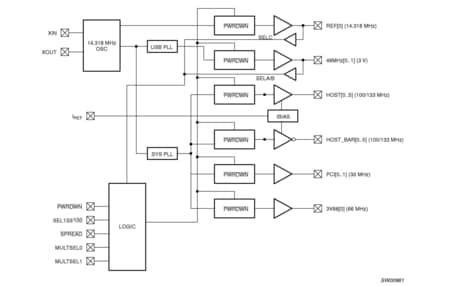 The part possesses a dedicated power-down input pin for power management control. This input is synchronized on chip, and ensures glitch-free output transitions. In addition, the part can be configured to disable the 48 MHz outputs for lower power operation and an increase in the performance of the functioning outputs. The REF and PCI outputs can also be disabled for the highest performance of the Host outputs.