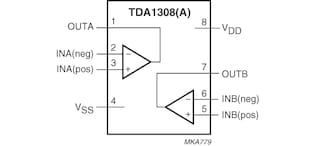 The TDA1308 is an integrated class-AB stereo headphone driver contained in an SO8 or a TSSOP8 plastic package. The device is fabricated in a 1 μm Complementary Metal Oxide Semiconductor (CMOS) process and has been primarily developed for portable digital audio applications.