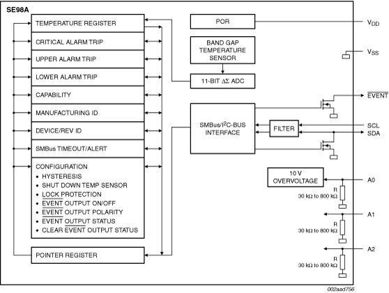 The SE98A supports the industry-standard 2-wire I²C-bus/SMBus serial interface. The SMBus TIMEOUT function is supported to prevent system lock-ups. Manufacturer and Device ID registers provide the ability to confirm the identify of the device. Three address pins allow up to eight devices to be controlled on a single bus.