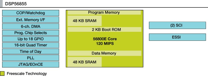 The DSP56855, a member of the DSP56800E core-based family of digital signal controllers, combines the processing power of a DSP and the functionality of a microcontroller with a flexible set of peripherals on a single chip. An extremely cost-effective solution, the DSP56855 is well-suited for many applications because of its low cost, flexibility and compact program code. The DSP56855 includes many peripherals especially useful for teledatacom devices, Internet appliances, portable devices, TAD, voice recognition, hands-free devices and general purpose applications.