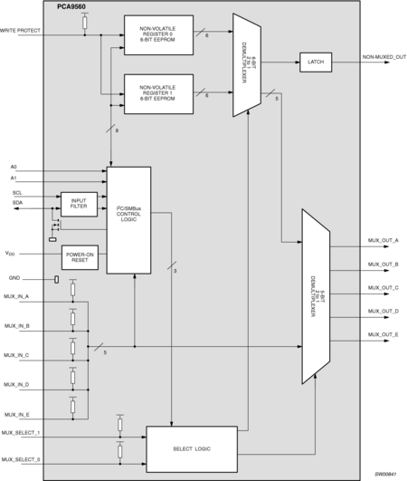 The PCA9560 is a 20-pin CMOS device consisting of two 6-bit non-volatile EEPROM registers, 5 hardware pin inputs and a 5-bit multiplexed output with one latched EEPROM bit. It is used for DIP switch-free or jumper-less system configuration and supports Mobile and Desktop VID Configuration, where 3 preset values (2 sets of internal non-volatile registers and 1 set of external hardware pins) set processor voltage for operation in either performance, deep sleep or deeper sleep modes. The PCA9560 is also useful in server and telecom/networking applications when used to replace DIP switches or jumpers, since the settings can be easily changed via I²C/SMBus without having to power down the equipment to open the cabinet. The non-volatile memory retains the most current setting selected before the power is turned off.