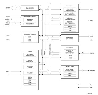 Also provided on the SCC68681 are a multipurpose 6-bit input port and a multipurpose 8-bit output port. These can be used as general purpose I/O ports or can be assigned specific functions (such as clock inputs or status/interrupt outputs) under program control.