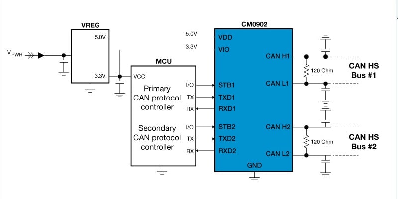 The NXP® MC34CM0902 dual CAN high-speed physical layer is a cost-effective product designed to target standard CAN high-speed applications requiring multiple transceivers. The transceivers are used to convert digital protocol information into analog CAN communication.