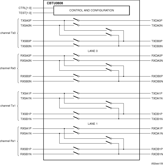 The switch elements are controlled by internal control logic to set switch positions in accordance with these three configurations, selectable by CMOS inputs CTRL0 and CTRL1 for lanes 0 and 1 respectively. Within a lane, the switch configuration is always applied identically to both transmit and receive channels.