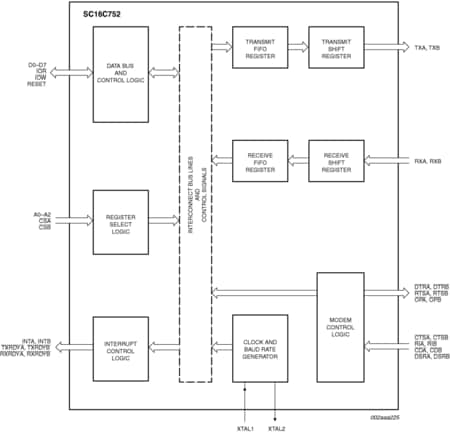 The SC16C752 is a dual universal asynchronous receiver/transmitter (UART) with 64-byte FIFOs, automatic hardware/software flow control, and data rates up to 5 Mbits/s (3.3 V and 5 V). The SC16C752 offers enhanced features. It has a transmission control register (TCR) that stores receiver FIFO threshold levels to start/stop transmission during hardware and software flow control. With the FIFO RDY register, the software gets the status of TXRDY/RXRDY for all four ports in one access. On-chip status registers provide the user with error indications, operational status, and modem interface control. System interrupts may be tailored to meet user requirements. An internal loop-back capability allows on-board diagnostics.