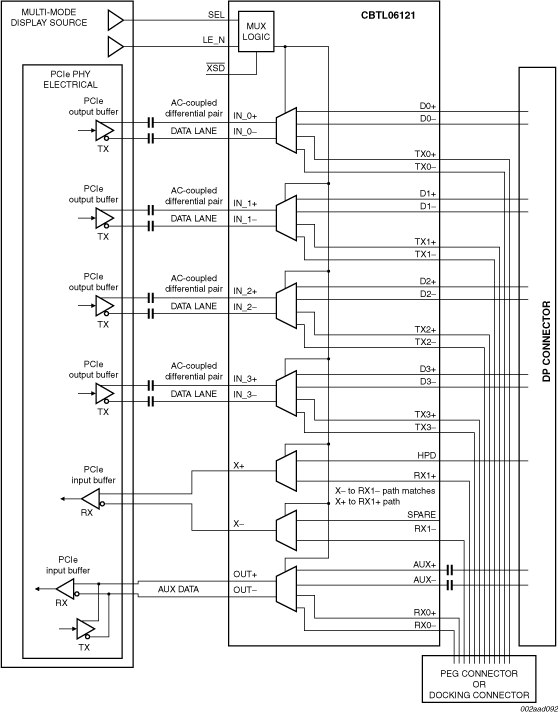 The CBTL06121 is a six-channel (âhexâ) multiplexer for DisplayPort and PCI Express applications at Generation 1 (âGen1â) speeds. It provides four differential channels capable of switching or multiplexing (bidirectional and AC-coupled) PCI Express or DisplayPort signals, using high-bandwidth pass-gate technology. Additionally, it provides for switching/multiplexing of the Hot Plug Detect signal as well as the AUX or DDC (Direct Display Control) signals, for a total of six channels.