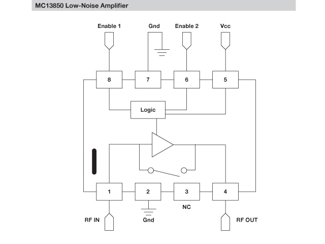 The MC13850 is a cost-effective, high IP3 low-noise amplifier (LNA) with low noise figure. This is the leadless package version of the popular MBC13720 device. As with the MBC13720, this device is designed for general purpose RF applications, yet has excellent high frequency gain and noise figure. An integrated bypass switch is included to preserve high input intercept performance. The input and output match are external to allow maximum design flexibility. The LNA has two selectable IP3 modes, a bypass mode and a standby mode. The MC13850 is fabricated with an advanced RF BiCMOS process using the SiGe:C module and is packaged in the MLPD-8 leadless package.