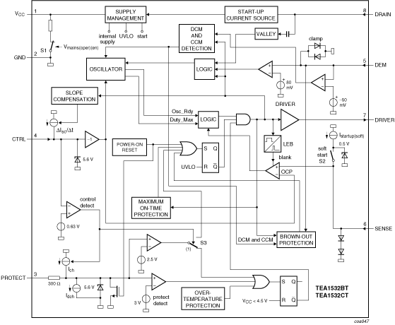 The GreenChip II is the second generation of controller ICs intended for green flyback Switched Mode Power Supplies (SMPS). Its high level of integration allows the design of a cost effective power supply with a very low number of external components. The TEA1532BT; TEA1532CT can also be used in fixed frequency, Continuous Conduction Mode (CCM) converter designs for low voltage and high current applications. At low power (standby) levels the system operates in cycle skipping mode which minimizes the switching losses during standby.