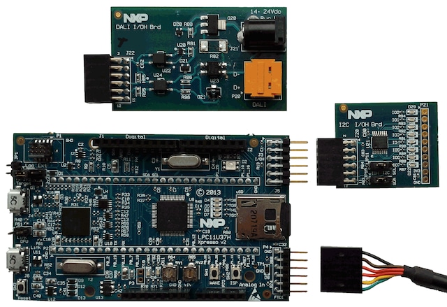 The LPCX11U37H I/O handler kit uses the PMOD interface connections for the specialized I2C and DALI daughter cards, with the LPCXpresso-side connector being male rather than female. In the LPCXpresso11U37H only version (available July 2014) does not have a PMOD connector fitted, so one can be added for use with standard PMOD-compatible cards.
