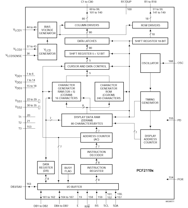 The PCF2119x is a low power CMOS LCD controller and driver, designed to drive a dot matrix LCD display of 2-lines by 16 characters or 1-line by 32 characters with 5 × 8 dot format. All necessary functions for the display are provided in a single chip, including on-chip generation of LCD bias voltages, resulting in a minimum of external components and lower system current consumption. The PCF2119x interfaces to most microcontrollers via a 4-bit or 8-bit bus or via the 2-wire I²C-bus. The chip contains a character generator and displays alphanumeric and kana (Japanese) characters.