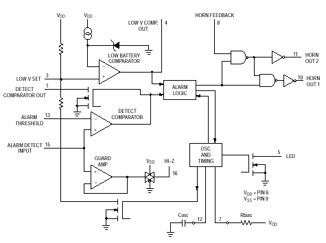 The MC14600 Alarm IC is designed to simplify the process of interfacing an alarm level voltage condition to a piezoelectric horn and/or LED. With an extremely low average current requirement and an integrated low batter detect feature, the part is ideally suited to battery operated applications. The MC14600 is easily configured, with a minimum of passives, to serve a wide range of applications. Typical applications include intrusion alarms, moisture or water ingress alarms, and toxic gas warning systems.