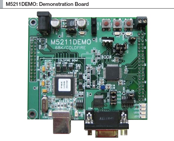 Development with the ColdFire® family of microcontrollers has never been easier or more cost-efficient than with the M5211DEMO kit. The M5211DEMO single board computer is a fully assembled, fully functional development board for the NXP® MCF5211 microcontroller. An included serial cable, USB cable, and support software will allow the user to get started quickly. The low-cost development kit comes fully equipped with the low-cost, efficient, and powerful MCF5211 microcontroller as well as useful output utilities such as a potentiometer and Analog-to-Digital Converter utility for application demonstration. Demonstrating easy to get, easy to use ColdFire development support, the M5211DEMO is a low cost development system for the NXP MCF521x ColdFire microcontroller family.