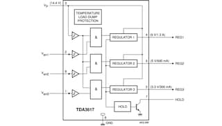 The TDA3617 is a multiple output voltage regulator with three independent regulators. It contains: