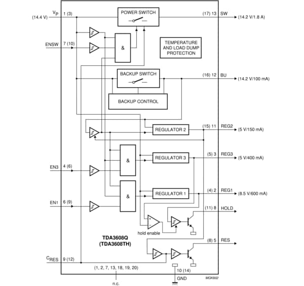 The TDA3608 is a multiple output voltage regulator with a power switch, intended for use in car radios with or without a microcontroller. It contains: