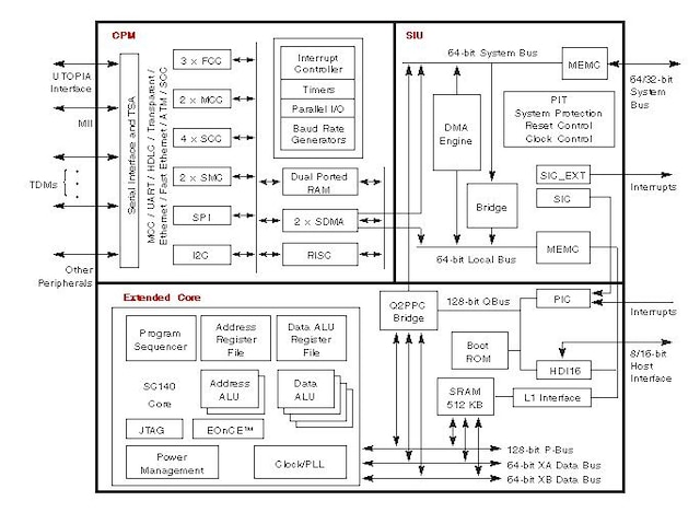 Communications Processor Module (CPM), a 64-bit 60x-compatible system bus, a