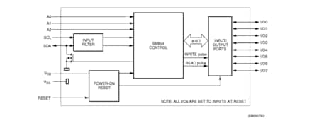 The PCA9556 is a silicon CMOS circuit which provides parallel input/output expansion for SMBus applications. The PCA9556 consists of an 8-bit input port register, 8-bit output port register, and an SMBus interface. It has low current consumption and a high impedance open drain output pin, I/O0.