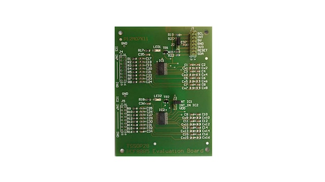 The OM11056 is a PCA8885 and PCF8885 evaluation board which can be used to demonstrate and evaluate the 8-channel capacitive touch and proximity switch. The PCB is designed to make it easy to adjust the switch’s sensitivity. The board can be powered with 3.3 V or 5 V and the communication will be made through the I²C interface.
