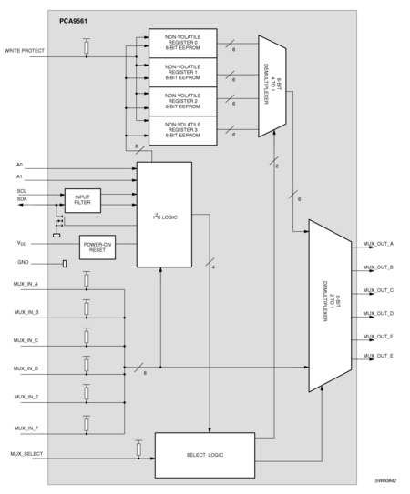 The PCA9561 is a 20-pin CMOS device consisting of four 6-bit non-volatile EEPROM registers, six hardware pin inputs and a 6-bit multiplexed output. It is used for DIP switch-free or jumper-less system configuration and supports Mobile and Desktop VID Configuration, where five preset values (four sets of internal non-volatile registers and one set of external hardware pins) set processor voltage for operation in various performance or battery conservation sleep modes. The PCA9561 is also useful in server and telecommunications/networking applications when used to replace DIP switches or jumpers, since the settings can be easily changed via I²C-bus/SMBus without having to power down the equipment to open the cabinet. The non-volatile memory retains the most current setting selected before the power is turned off.