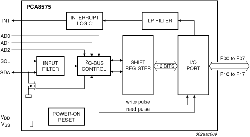 The PCA8575 also possesses an interrupt line (INT) which can be connected to the interrupt logic of the microcontroller. By sending an interrupt signal on this line, the remote I/O can inform the microcontroller if there is incoming data on its ports without having to communicate via the I²C-bus. The internal Power-On Reset (POR) initializes the I/Os as inputs.