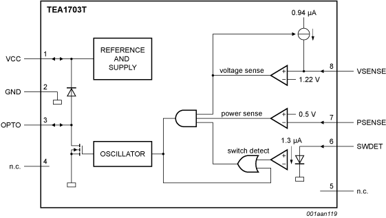 The TEA1703T is a low power standby controller IC intended to be used in applications which require an extreme low no-load standby power. The TEA1703T includes circuitry for detecting output voltage, output power and switching. The TEA1703T integrates a switched-mode optocoupler driver, which enables an optocoupler to be driven with a high peak current while keeping the required power low. The TEA1703T’s typical current consumption is 30 μA. In a typical notebook adapter application the TEA1703T’s power consumption is less than 0.5 mW.