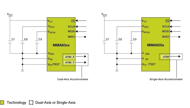 The MEMS-based MMA65xxKW single- and dual-axis inertial sensors target the main electronic control unit (ECU) for automotive airbag systems.