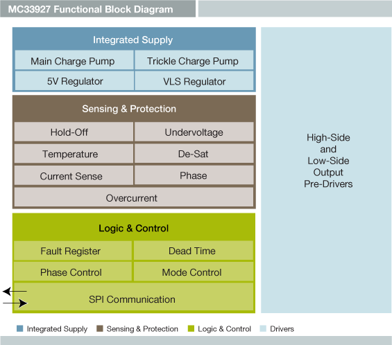The MC33927 is a Field Effect Transistor (FET) pre-driver designed for three-phase motor control and similar applications. The integrated circuit (IC) uses SMARTMOS® ™ technology.