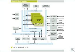 The MSC8113 is a highly integrated system-on-chip (SoC) that combines three StarCore® SC140 extended cores with a RS-232 serial interface, four time division multiplexed (TDM) serial interfaces, 32 general-purpose timers, a flexible system interface unit (SIU), an Ethernet interface and a multi-channel DMA controller. The three extended cores can deliver a total 3600/4800 DSP MMACS performance at 300/400 MHz.