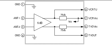 The MC44BC380 boosts the antenna signal, then splits the signal into two 75-ohm outputs for the TV and the following auxiliary outputs: