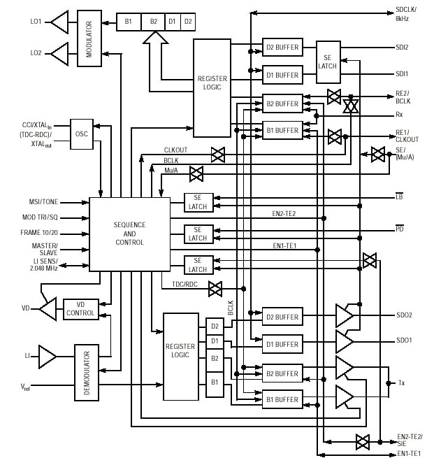 In the UDLT-1 mode, this device, when operated at +5 V VDD, supports a full duplex 64-kbps data channel and two 8 kbps signaling channels over one 26 AWG and larger wire pair up to 2 km. In the UDLT-2 mode, this device, when operated at +5 V VDD, is capable of full duplex communication consisting of two 64 kbps data channels, and two 16 kbps signaling channels over one 26 AWG and larger wire pair up to 1 km. This signaling format, known as 2B+2D, is compatible with ISDN.