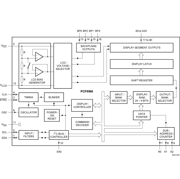 The PCF8566 is a peripheral device which interfaces to almost any Liquid Crystal Display (LCD) with low multiplex rates. It generates the drive signals for any static or multiplexed LCD containing up to four backplanes and up to 24 segments and can easily be cascaded for larger LCD applications. The PCF8566 is compatible with most microprocessors or microcontrollers and communicates via a two-line bidirectional I²C-bus. Communication overheads are minimized by a display RAM with auto-incremented addressing, by hardware subaddressing and by display memory switching (static and duplex drive modes).