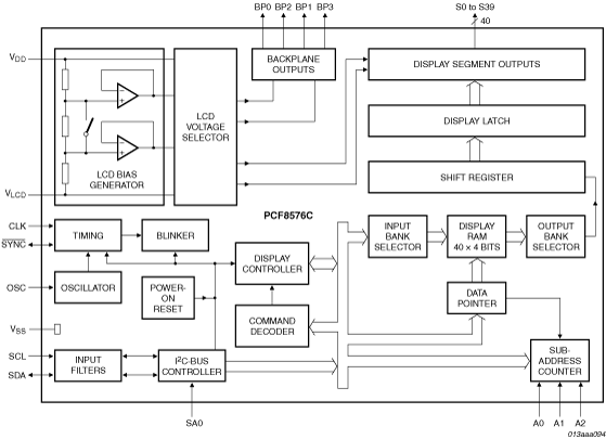 The PCF8576C is a peripheral device which interfaces to almost any Liquid Crystal Display (LCD) with low multiplex rates. It generates the drive signals for any static or multiplexed LCD containing up to four backplanes and up to 40 segments and can easily be cascaded for larger LCD applications. The PCF8576C is compatible with most microprocessors or microcontrollers and communicates via a two-line bidirectional I²C-bus. Communication overheads are minimized by a display RAM with auto-incremented addressing and by hardware subaddressing.