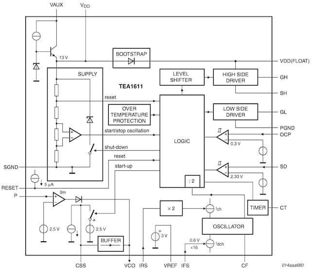 The TEA1611T is a monolithic integrated circuit implemented in a high voltage Diffusion Metal Oxide Semiconductor (DMOS) process, which is a high voltage controller for a zero voltage switching resonant converter. The IC provides the drive function for two discrete power MOSFETs in a half-bridge configuration. It also includes a level-shift circuit, an oscillator with accurately programmable frequency range, a latched shut-down function and a transconductance error amplifier.