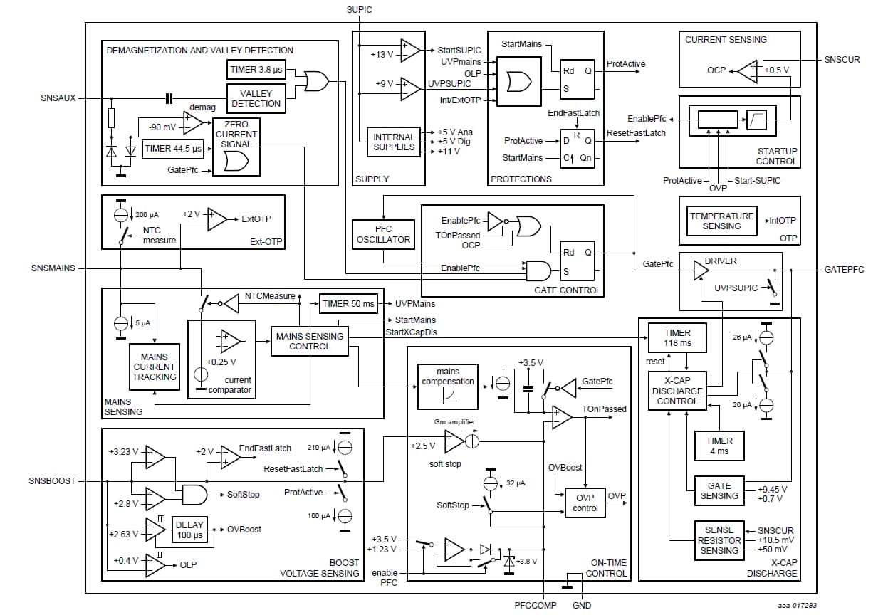 The TEA19162T is a power factor correction (PFC) controller. The IC communicates with theTEA19161T on start-up sequence and protections. It also enables a fast latch reset mechanism. To maximize the overall system efficiency, the TEA19161T allows setting the TEA19162T PFC to burst mode at a low output power level.