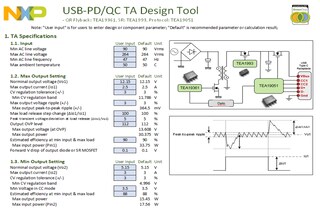 The NXP® USB-PD3.0 / QC4.0 smart charging design tool helps you design a fast charging adapter supporting BC1.2, USB-PD3.0 and/or QC4.0 charging protocol. NXP's primary QR Flyback controller TEA1936x and secondary side synchronous rectifier controller TEA199x are very suited for a low-cost solution.