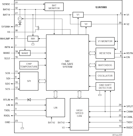 The UJA1065 fail-safe System Basis Chip (SBC) replaces basic discrete components that are common in every Electronic Control Unit (ECU) with a Controller Area Network (CAN) and a Local Interconnect Network (LIN) interface. The fail-safe SBC supports all networking applications that control various power and sensor peripherals by using high-speed CAN as the main network interface and LIN as a local sub-bus. The fail-safe SBC contains the following integrated devices: